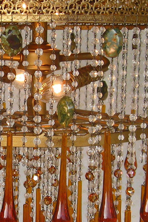 This version of the Lola chandelier is shorter to maximize ceiling height. Lola is stunning with an antiqued gold frame finish, English cut crystal strands with jasper stone accents and Italian teardrops.